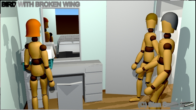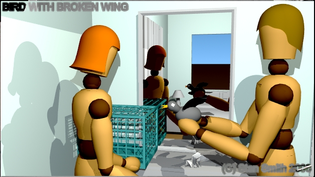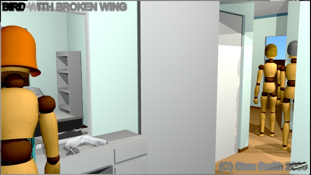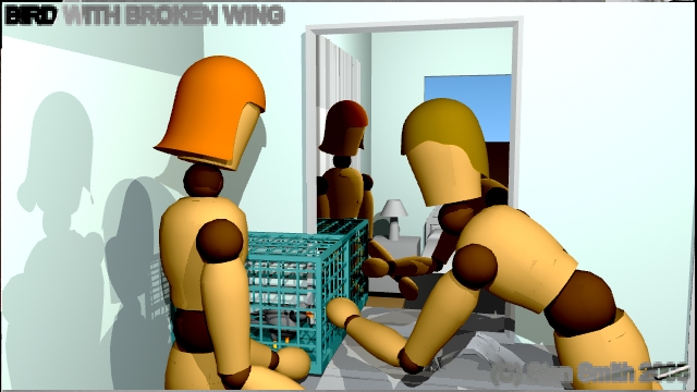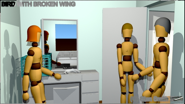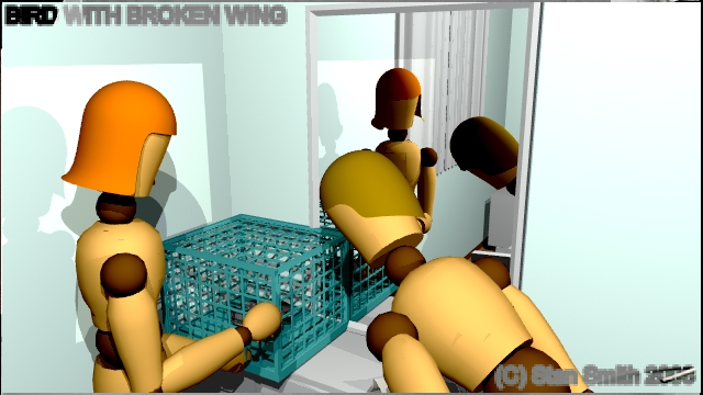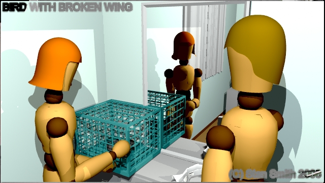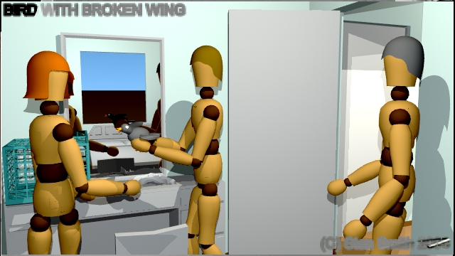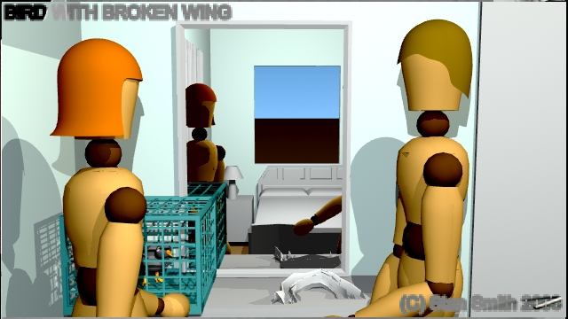 This is one scene of a film that I storyboarded. In this scene, a veterinarian visits a young lady to check out a sick bird she has found. By doing the storyboard with 3D software, The director could get a much better idea of camera angles and lighting in the confined spaces found in a practical set, (a real house) long before arriving on location to start shooting.